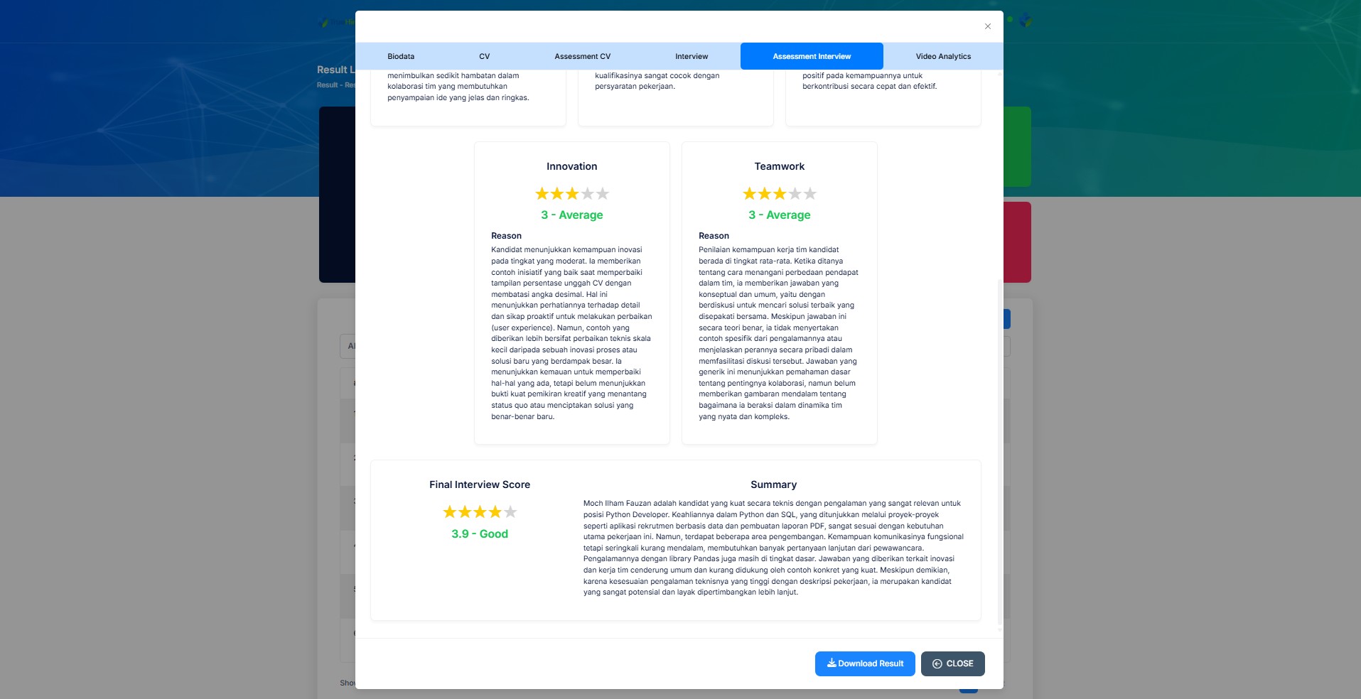 Provide an assessment of the results of interviews conducted by applicants